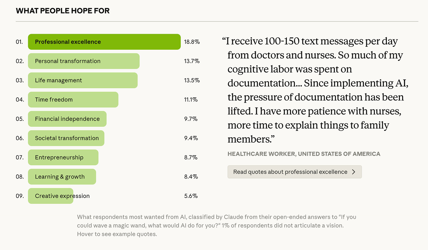 Anthropic used Claude to interview nearly 81,000 people across 159 countries in 70 languages about what they want from AI. Instead of a traditional survey, Claude ran branching conversations with follow-up questions based on each person’s answers. 67% were net positive about AI. The biggest group (19%) said they wanted “professional excellence,” but when pushed on what that meant, most people were really talking about quality of life: more time, less cognitive load, space to think.