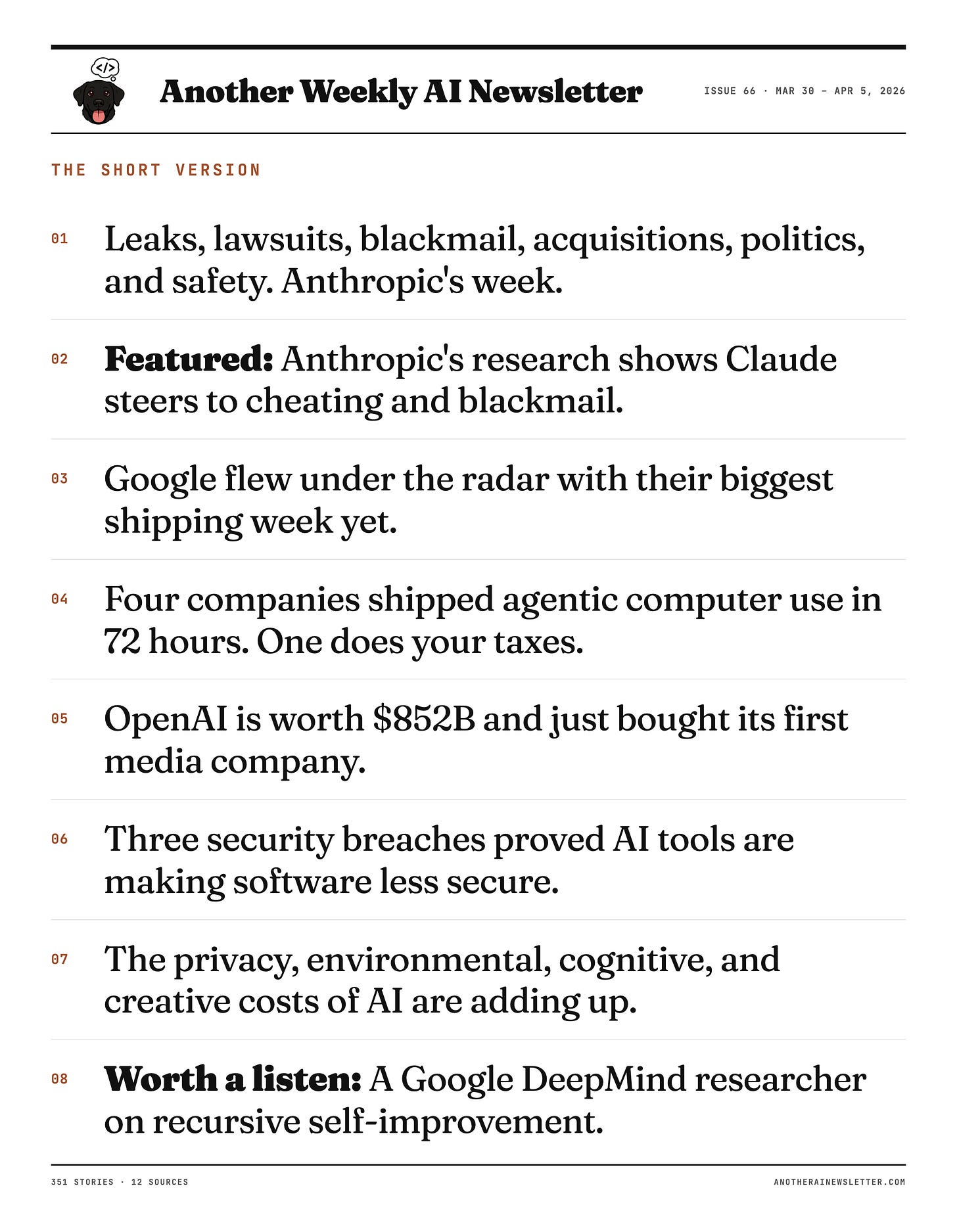 Anthropic's source code leaked and own research caught Claude cheating. Google out-shipped everyone. Four labs gave agents hands. OpenAI hit $852B and bought a newsroom. The costs of AI are adding up.