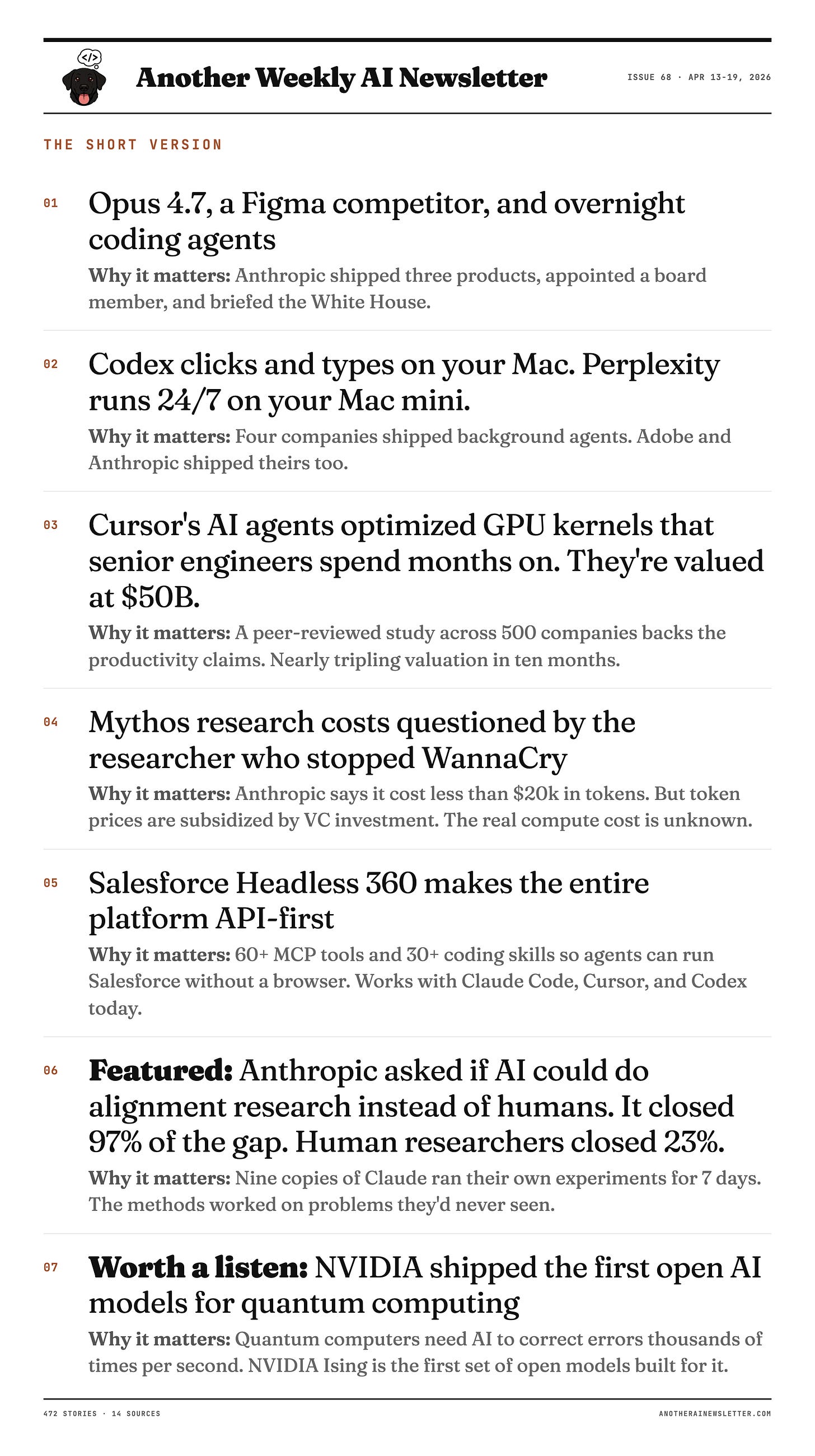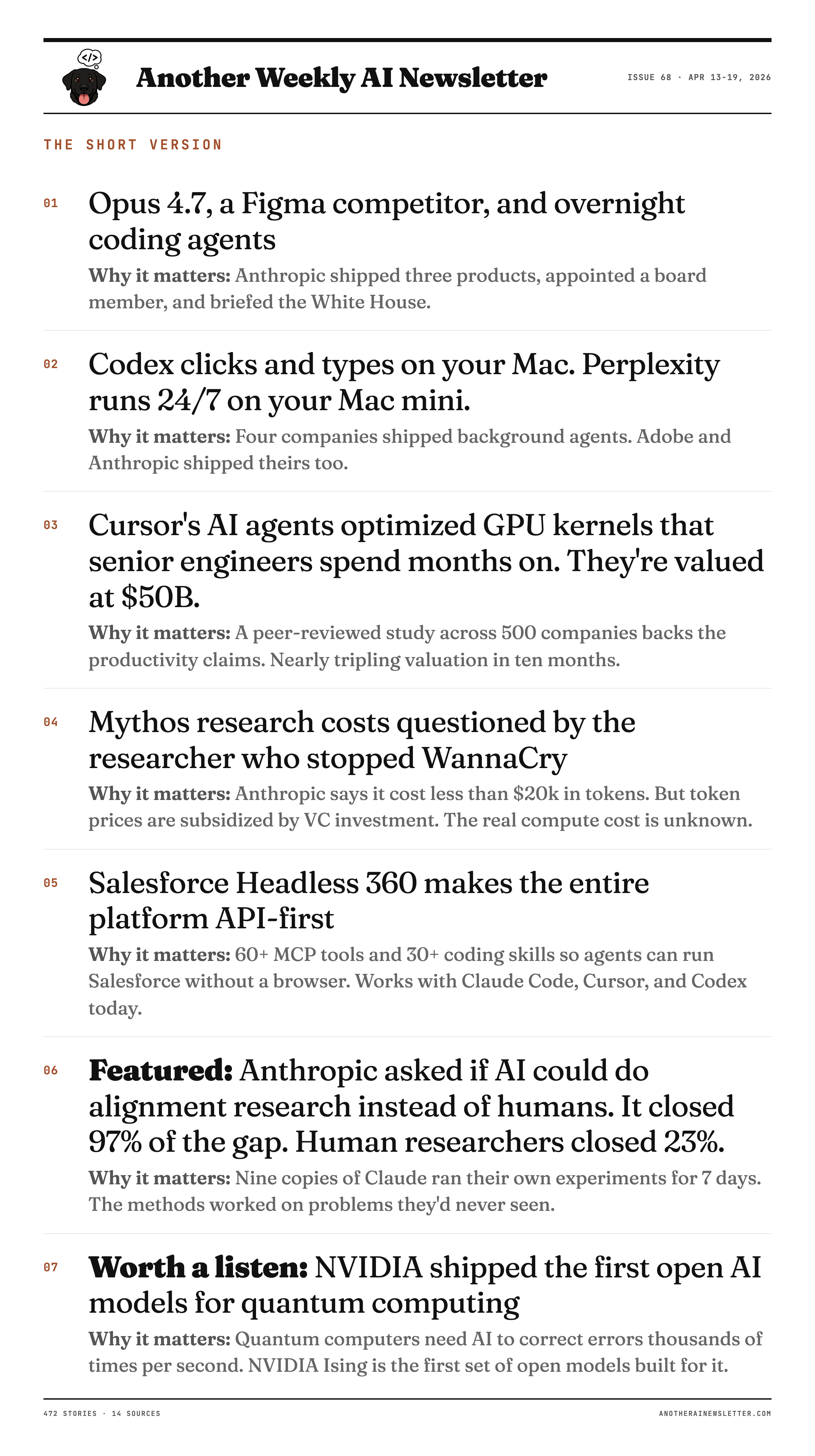 Anthropic shipped Opus 4.7, a Figma competitor, and overnight coding agents. Codex clicks and types on your Mac. Cursor is worth $50B. The WannaCry researcher questioned Mythos.