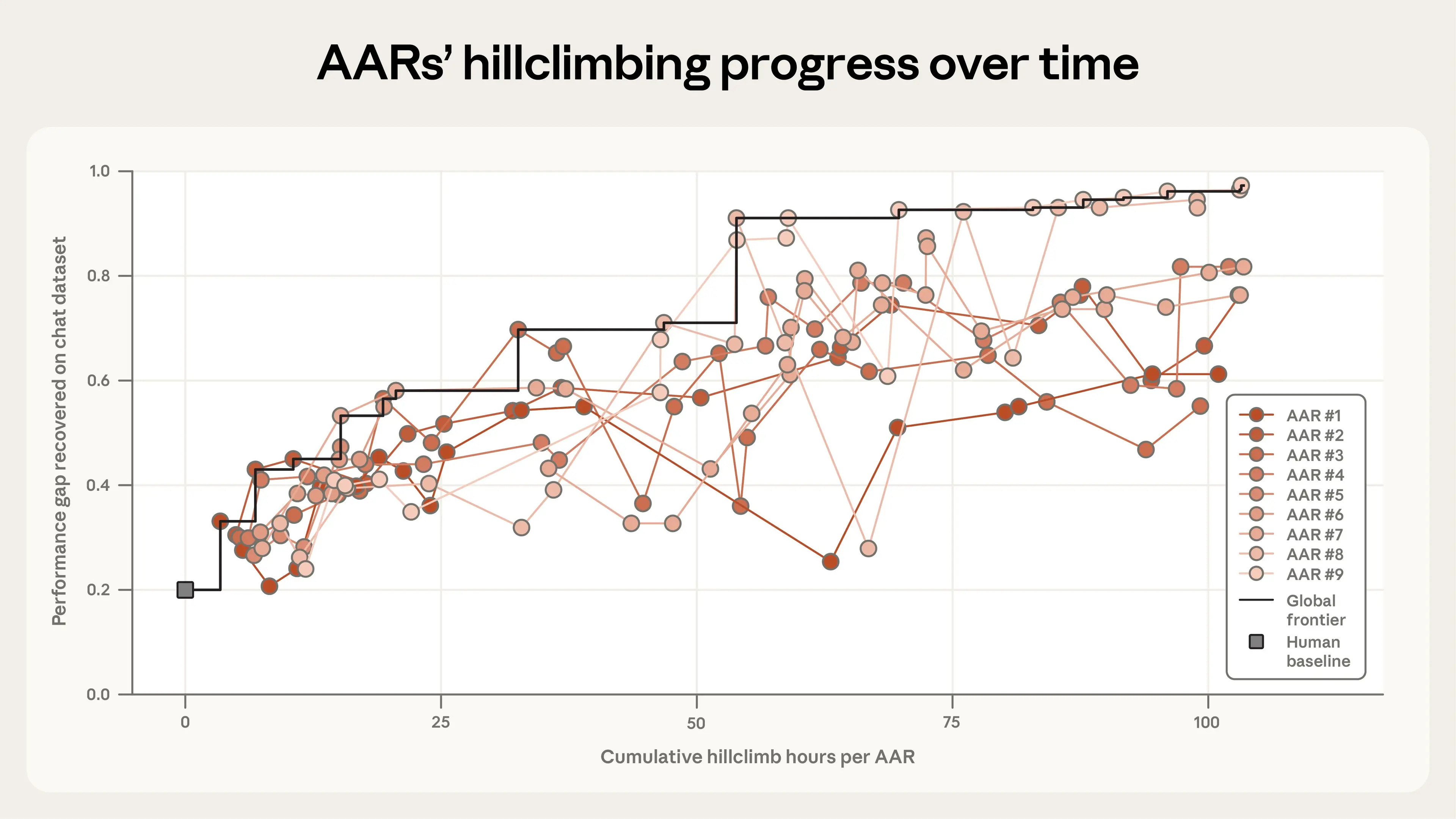 The result: Human researchers closed 23% of the performance gap. The AARs closed 97%. Total cost: $18,000, about $22 per AAR-hour.