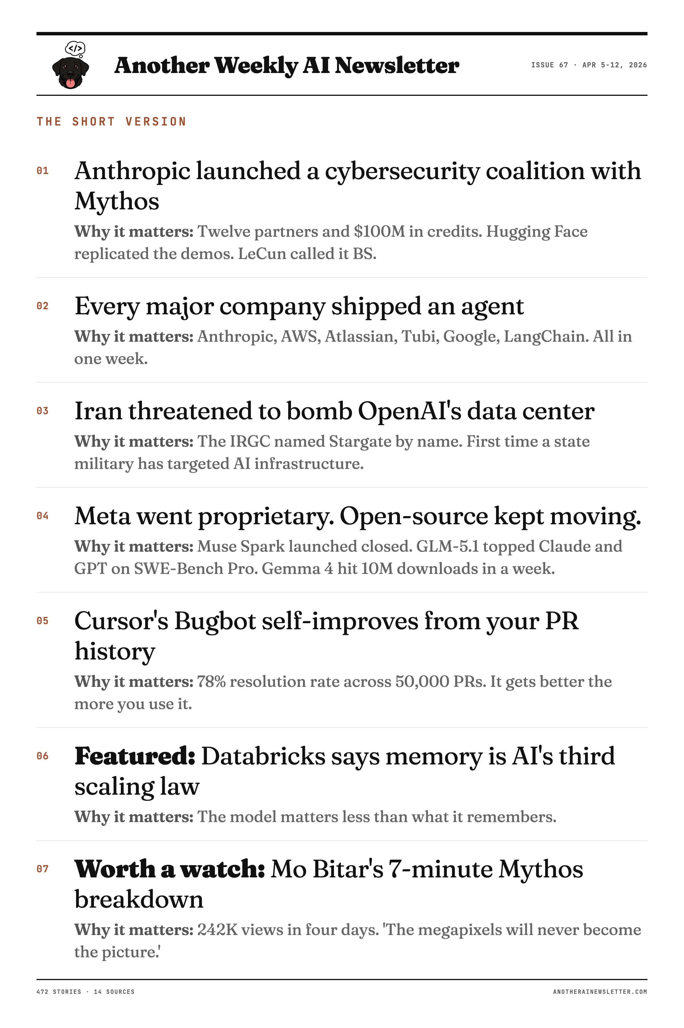 Mythos found thousands of zero-days and there are skeptics, Databricks proves memory scaling for agents, Iran threatened Stargate, Meta went proprietary, Cursor's bugbot self improves