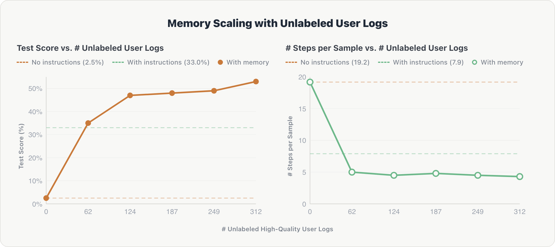 The wilder result was with unlabeled data. They fed the agent raw user conversation logs with no gold answers, just filtered for quality by an LLM judge. After just 62 log records, it outperformed hand-engineered domain instructions that took weeks to build. Accuracy jumped from 2.5% to over 50%.