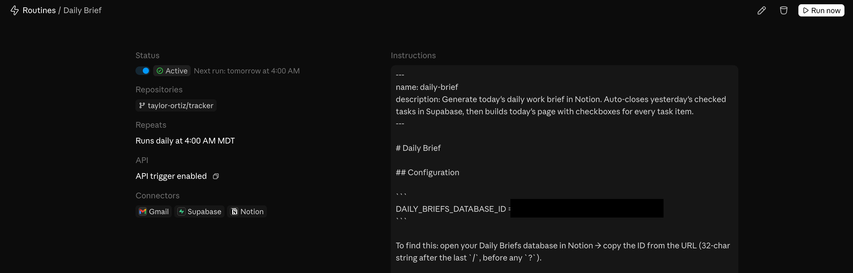 I decided to build a daily work brief: something that runs every weekday morning, queries my task database, reads my calendar, closes out what I finished yesterday, and drops a fresh Notion page ready for the day. Something I’d actually use.