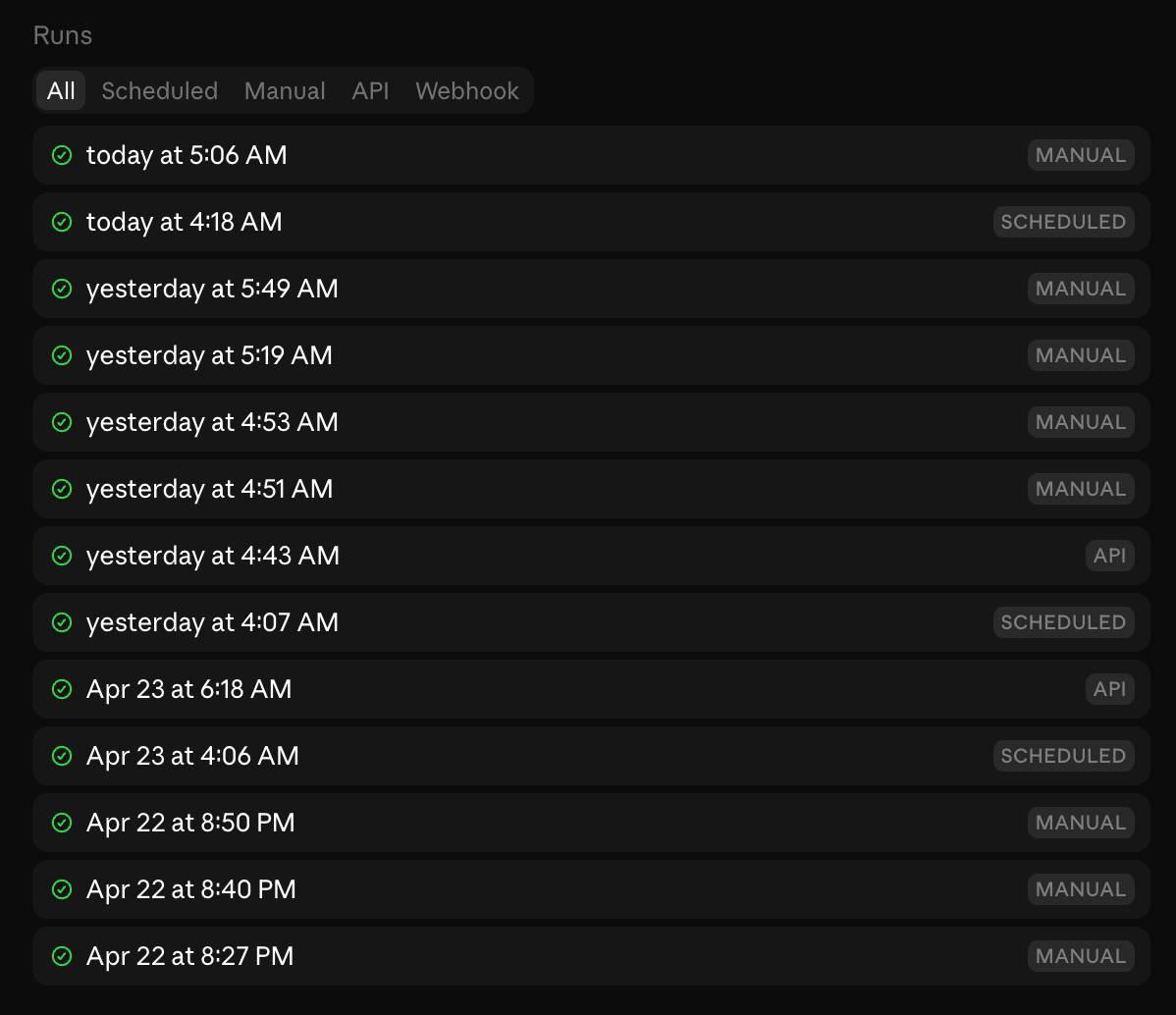 Runs are sessions: every run shows up in your session list like any other Claude session. You can open it after the fact, see exactly what Claude did, continue the conversation manually, or create a PR from it.