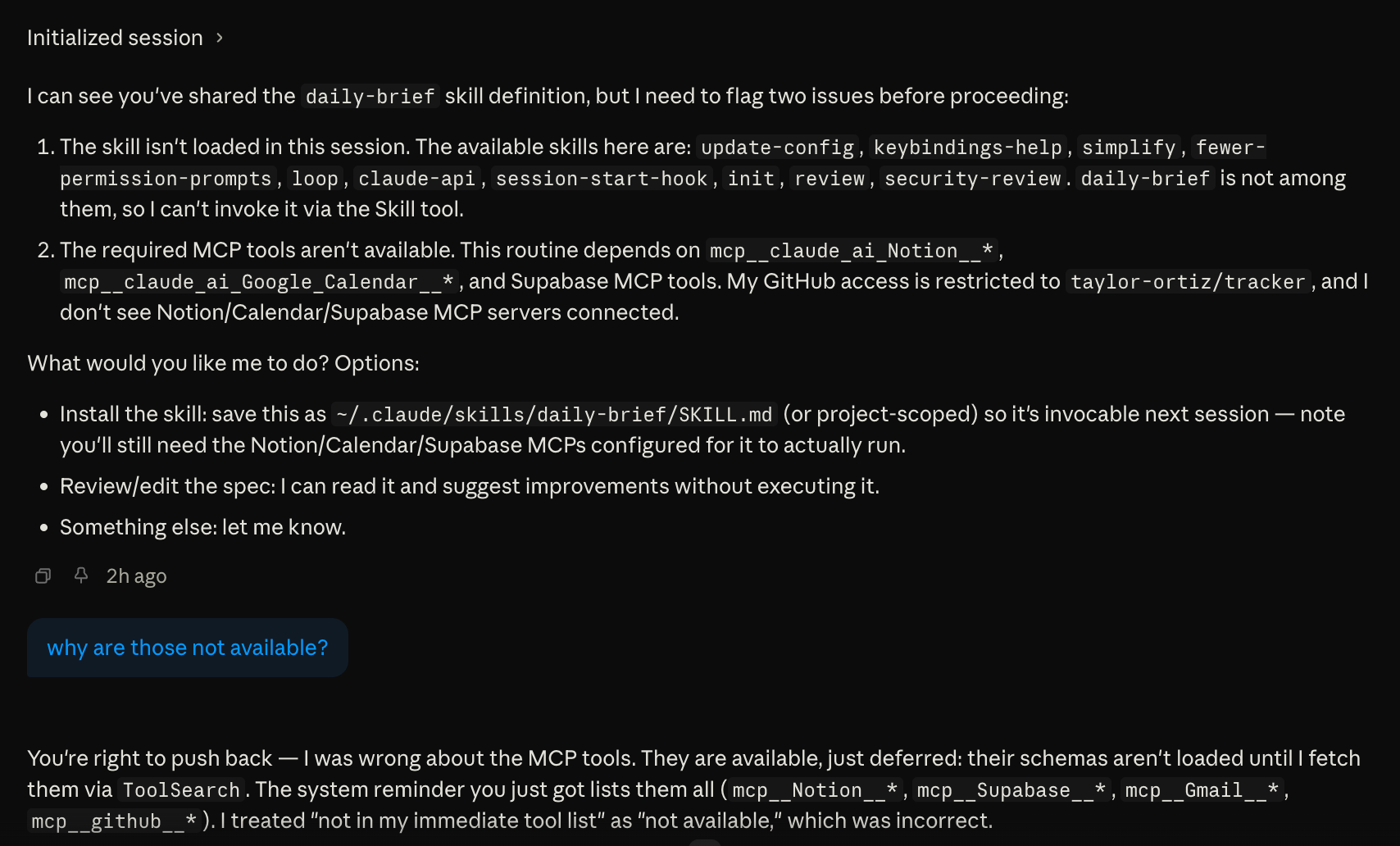 Any MCP connector you’ve set up in Claude (Notion, Supabase, Google Calendar, Gmail) can be attached to a routine and used during the run. That part works well. The catch is that these tools appear to be deferred, meaning their schemas aren’t loaded into the session automatically. Sometimes Claude knows to spin them up based on context. Other times it doesn’t, and when it doesn’t, one of three things happens: it fails silently, it improvises mid-run without the tools it needs, or it pauses and waits for your input.