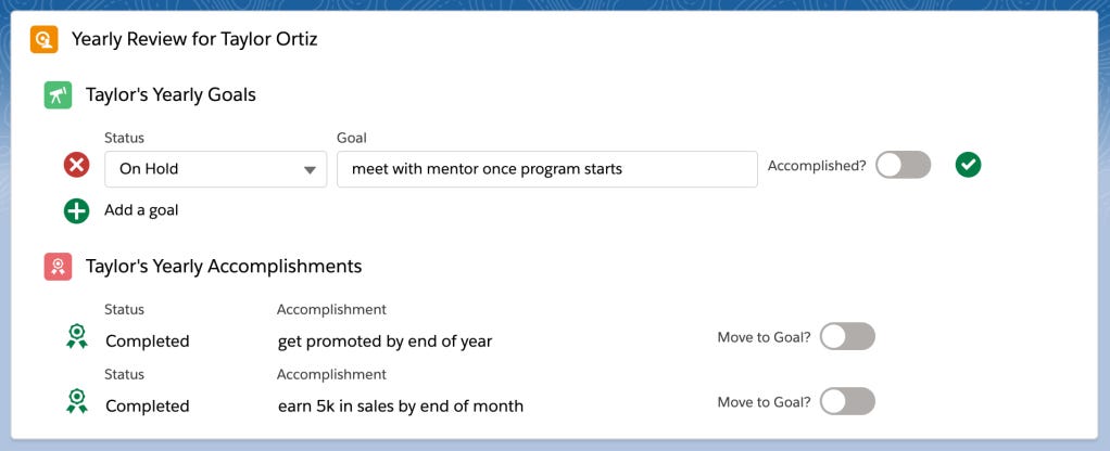 Project 2: Allow your Sales Reps to track their Goals and convert them to Accomplishments for their year end review with Lightning Web Components and 10 lines of Apex