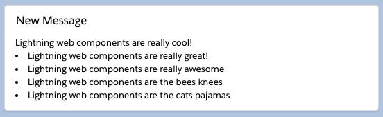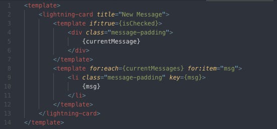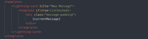 Let’s unpack this a little bit because there are a couple of things here. Notice how the if:true directive is nested in a template element? In standard web development, a template element holds the content inside hidden from the client and will not be rendered, unless by making it visible using JavaScript. Salesforce uses this same approach, however instead of relying on JavaScript to render content inside of a template element, they built special directives to manipulate the DOM. A directive is a special attribute that adds dynamic behavior to an HTML template. In the example above, if:true/false is a directive used to conditionally render DOM elements in a template. For more information on directives and how to use them, visit the documentation. So this is what we have so far!