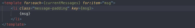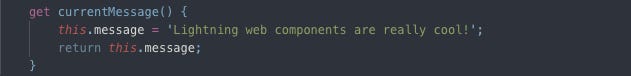 The reason that this property reference says currentMessage rather than message, the actual name of the property, is because we are referencing a getter method in the JavaScript that processes the property: